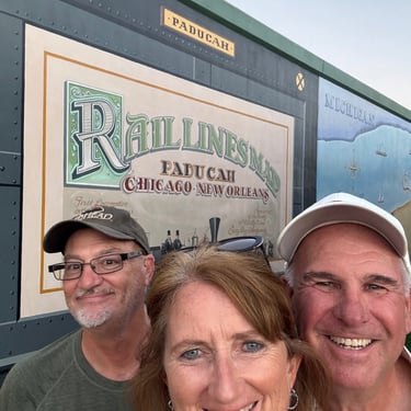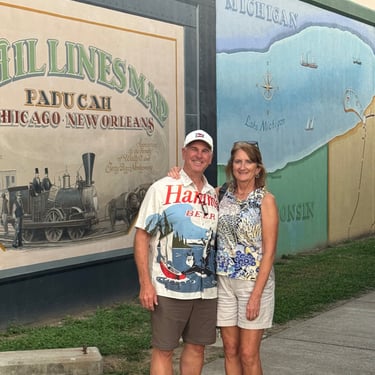Sorry for the long blog but did a lot of moving this week. Saturday we finished the Mississippi and anchored just before the Ohio at Angelo Towhead. On the way there we passed Cape Girardeau, Missouri, home of Rush Limbaugh. Would have loved to stop and see the town, however they have no place to dock so that was disappointing. I got a photo of their nice flood wall with the town name on it. With the heat again in the 90s and the generator possibly leaking with a strong diesel smell, we have not enjoyed the anchorages. But we made the best of it, and left early Sunday so the we could get to Paducah to a marina with power and water so wouldn't need to use the generator. We were very blessed to make it through the Olmsted lock on the Ohio with no wait and no other boats. This was amazing because there a tons of barges that go through there. Thus we made it to Paducah by about 3. Very nice pier to attach to with power and water. Paducah has a beautiful river front and has flood walls that they have decorated with murals on the city side. There are tons of restaurants and museums. We were able to tour the National Quilt Museum as recommended by Tim's Aunt Sandy , who has made quilts all of her life and they are amazing! Also caught up with fellow looper from Lindsay Park Yacht Club, Todd, who we had dinner with. Due to rain forecast we only spent the one evening there and left early the next morning to head to Green Turtle Bay Resort in Grand River, Kentucky on Monday morning. More on that next week as this blog has been too long!! It will be nice to stay several days in one place.