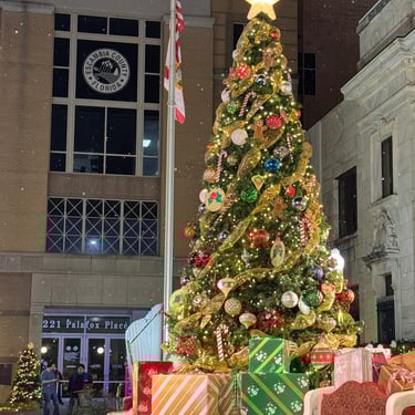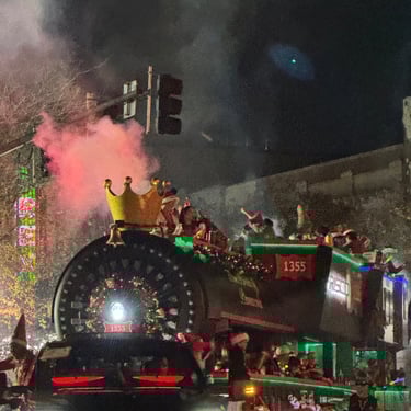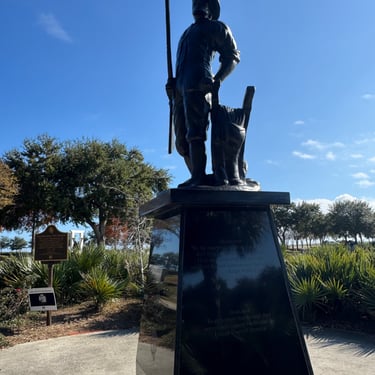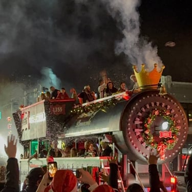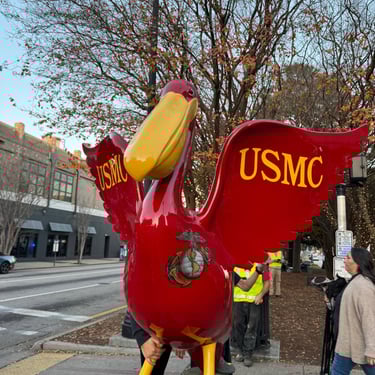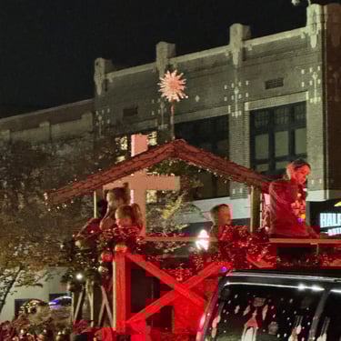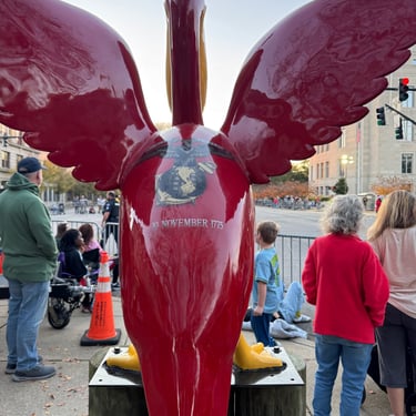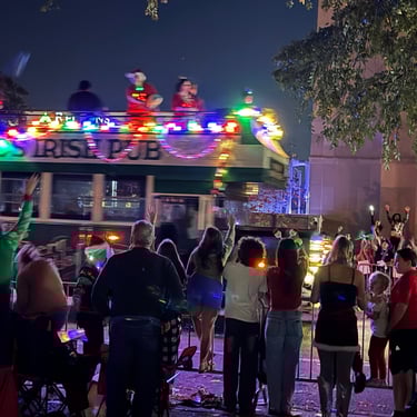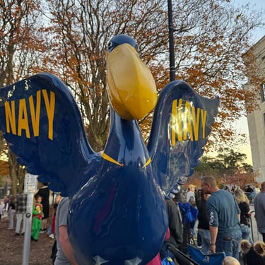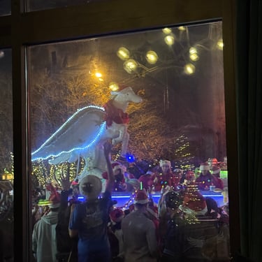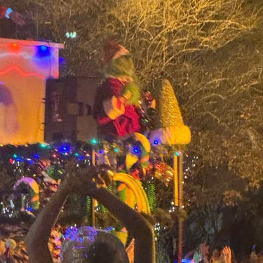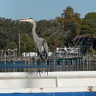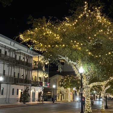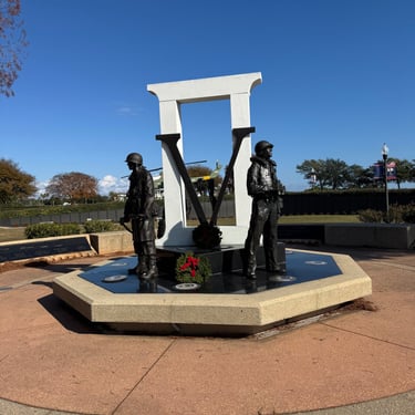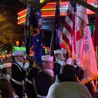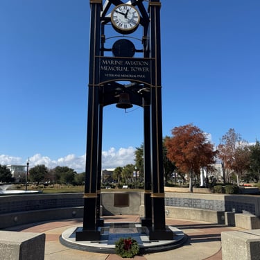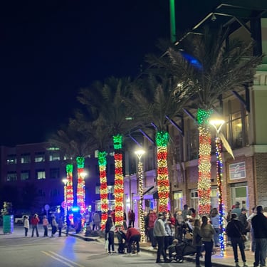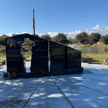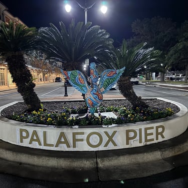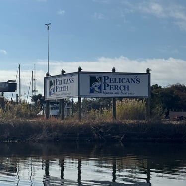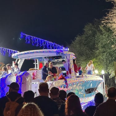 Friday, December 12 we headed to Pensacola to Pelican Perch Marina near downtown in Bayou Chico. It was a beautiful day and we were greeted by several dolphins around the boat and also by the Navy Blue Angels practicing near the Naval Air Station. We took an Uber into town to Nick's Boathouse and then walked over to Palafox Pier. We also saw the Pensacola Blue Wahoos baseball stadium all lit up for Christmas. Jaco's on Palafox Pier was a great place for dessert and to hear music. Saturday was in the 70s so we took a dinghy ride around Chico Bayou and into Pensacola Bay. We also saw lots of dolphins near our boat and many pelicans perching near our marina, thus the name "Pelican's Perch". We opted to stay in a hotel downtown as we had a free night from Marriott. We walked from there back to Palafox Pier and downtown. On the way we discovered the beautiful Veterans Memorial Park. In the evening was the Pensacola Christmas Parade so we enjoyed that from the Kennedy Lounge, and ended the night at McGuire's Irish Pub near the hotel, which we remembered from the 1980s when we lived here when Tim was in flight school with the Marines. Sunday the weather did a complete change so we headed back to the boat to prepare to leave for Ft. Walton Beach.