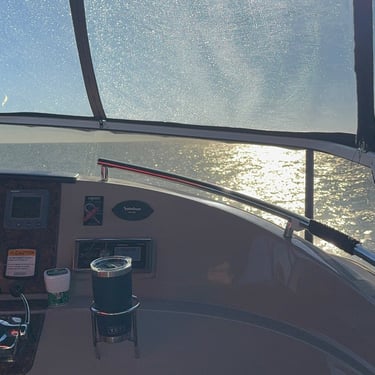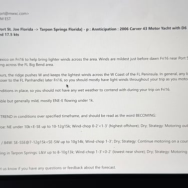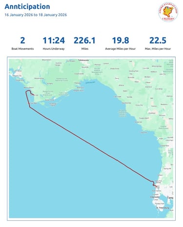 While in Port St. Joe, we got the idea of crossing the gulf from here instead of going on to Carrabelle like most loopers do. The long term forecast did not show a lot of good days ahead so it made sense just to try and cross from Port St. Joe. We plan to visit the towns we missed, Appalachicola and Carraballe, at a future date after we finish the Loop. The crossing is a little longer from Port St. Joe but seemed doable. Since we can cruise at 21 mph at 3200 rpm, we chose to do a daytime crossing. Slower boats must travel overnight so they arrive in Tarpon Springs in daylight to avoid hitting crab traps. Staying awake all night did not appeal to either of us so we waited for a good weather day to be able to cross in daylight. The AGLCA has a daily email regarding weather and wave heights. We also purchased a custom forecast for our boat from Marine Weather Center. We chose to head out on Friday, January 16th, knowing it would be a little bumpy but a "perfect" weather day did not seem to be coming up any time soon. Although we traveled solo, a couple other boats were scheduled to head on the same route later in the day so if something happened we could contact them. We have a subscription to Seatow which was another back up plan in case we broke down. We left about 7 am at first light and it was only 32 degrees. We bundled up and had the boat all batten down to keep gear from rolling around the decks. The trip from Port St. Joe in open waters was about 212 miles. The furthest we were from shore was 70 miles. It was rougher than we thought it would be and we think some of the waves were 4 or 5 feet. For the most part the forecast was pretty accurate. We don't have auto-pilot on our boat and Tim did a truly amazing job holding the course. I know because I took the helm a couple times and had a very hard time holding course as the wind and waves would immediately pointed me to Venezuela(so says Tim). The navigation devices had a delay so a constant scan of the chart, rudder position, and compass heading was needed to keep a minimal variance in course through the water. I don't have many good photos since it was a pretty bumpy ride and we couldn't move anywhere on the boat without holding on the entire time. Needless to say the entire boat was covered with salt from sea spray. We made it to anchorage near Anclote Key outside of Tarpon Springs before dark, about 5:45 and it was still light enough that we could see and avoid running into crab traps, which are marked with white balls in the water attached with ropes from the crab traps. The ropes can get tangled up in the prop shafts and stop the engines, thus the need to avoid them. Needless to say we were quite ready to celebrate with one of the special Caymus wines we were given, and hunker down for the evening. We thanked God for a safe voyage! The first photo shows Port St. Joe in the moonlight at 7 am when we left. The second one is the custom forecast which pretty much panned out. In some of the other photos you can see a few white caps and sea swell.