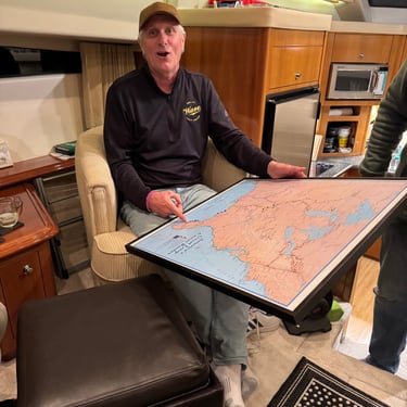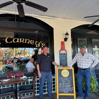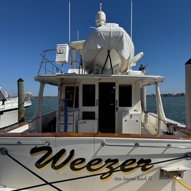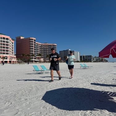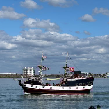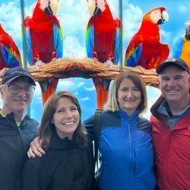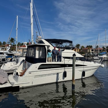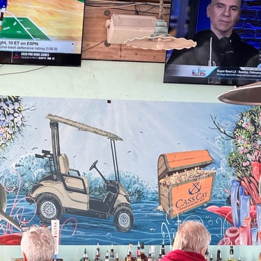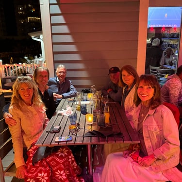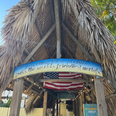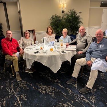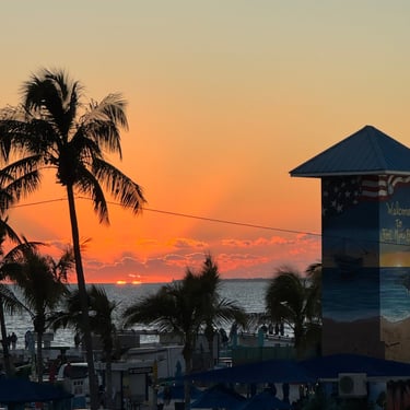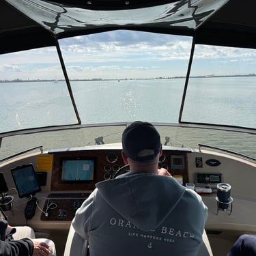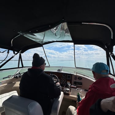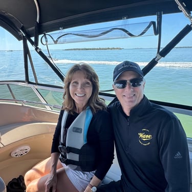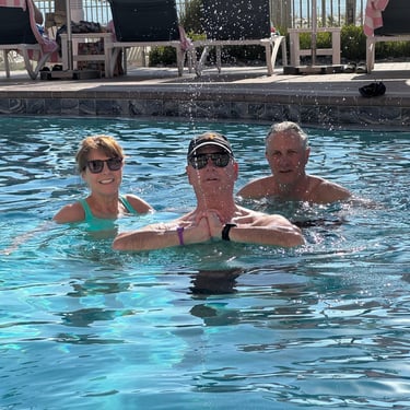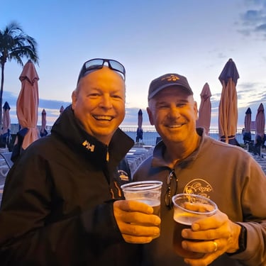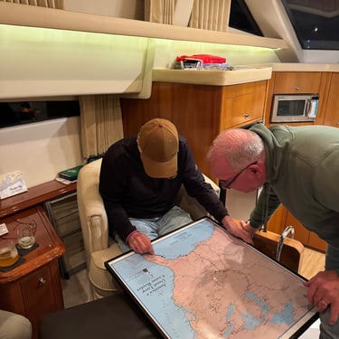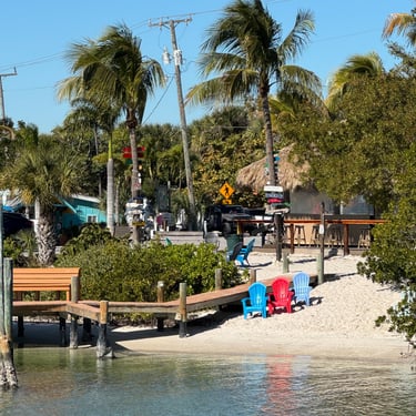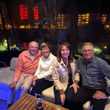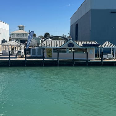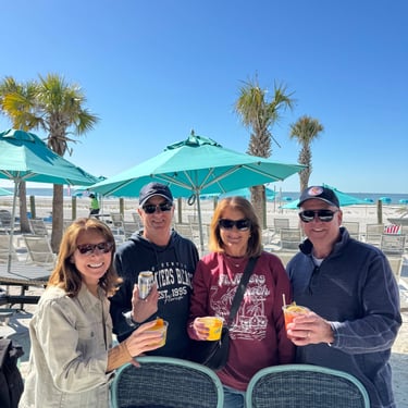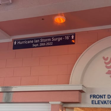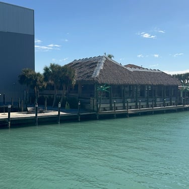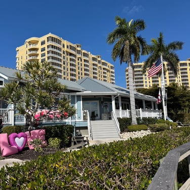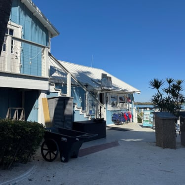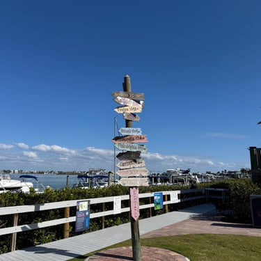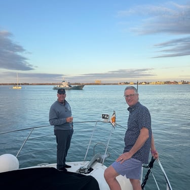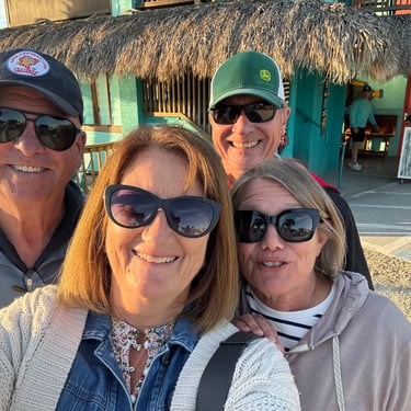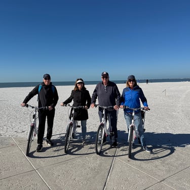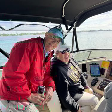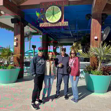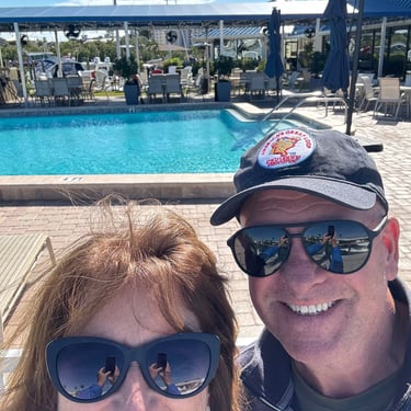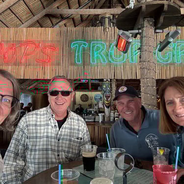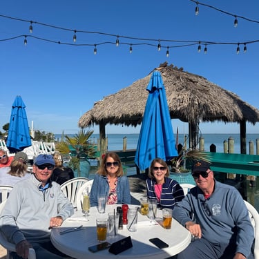 Wednesday, February 4, Keith and Marcia joined us to cruise to Fort Myers Beach. We had a pretty warm day and could ride up on the bow for a bit. Keith and Tim are in a biking group back home and their biking friend Jim has a boat on Sanibel so he greeted us in his boat! It was a short ride to Pink Shell Resort which some friends had recommended. We are glad they did because with a reasonably priced boat slip with an AGLCA discount, we have all of the amenities of the resort! We have access to the pool and beach and even free breakfasts! The area is great too with free shuttles and trolleys and bikes to go to the nearby attractions on Fort Myers Beach. The day we arrived was very warm so we went to the beach and pool. One photo shows the 16 foot storm surge line from Hurricane Ian. They have made a nice comeback from that. For dinner, Jim and his wife Ann, joined us at Rae's Italian Cuisine at the resort. Thursday was back to cold and windy again, but we took the enclosed trolley downtown and went to a few restaurants and a couple of us bought sweatshirts due to the cold! We checked out the Margaritaville resort too. We came back and played cards and then ate at Rae's again since it is the one inside restaurant at Pink Shell. Friday we took the free pink bikes offered by the hotel downtown and stopped to see the beachfront Margarativille area. Keith and Marcia had to leave at noon so after that we worked on laundry (also free at the resort) and administrative tasks. We met another looper couple while here who happens to be a former Marine Corps helicopter pilot like Tim. They did not fly together but were good friends with the same people. Brad and Kim have a Fleming Yacht named Weezer. Brad flew Ch46s and also flew for the President while attached to HMX-1 in Quantico, VA. It truly is a small world! We are still at Pink Shell as of this posting and may stay until Feb 23 before heading to Marco Island with Tim's sister and brother-in-law. Stay tuned until later this month!